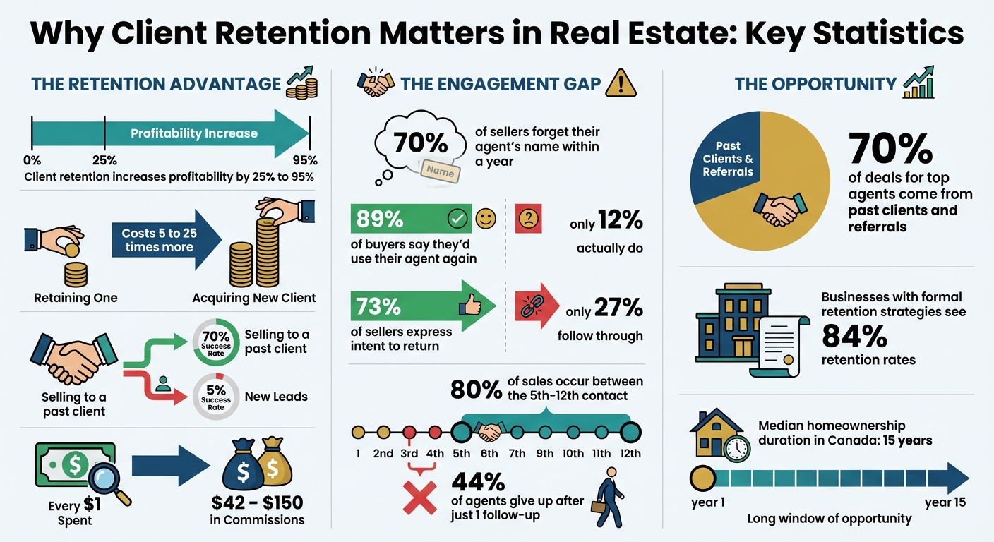This kind of thoughtful, post-closing support keeps you top-of-mind and strengthens your client relationships. The numbers back this up too: selling to a past client has a 70% success rate, compared to just 5% for new leads 19. While maintaining these relationships might cost around $200–$350 per client annually, the return is impressive - every dollar invested can yield $42 to $150 in commission 2.