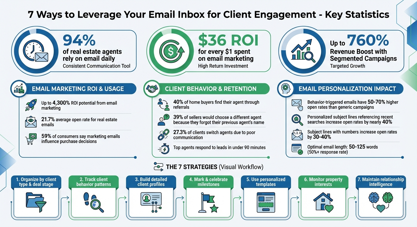 Your email inbox is more than a communication tool - it's a powerful resource for building lasting client connections. With 94% of real estate agents relying on email daily and an ROI of $36 for every $1 spent, email remains the most cost-effective way to engage clients. Here’s how you can make your inbox work for you: