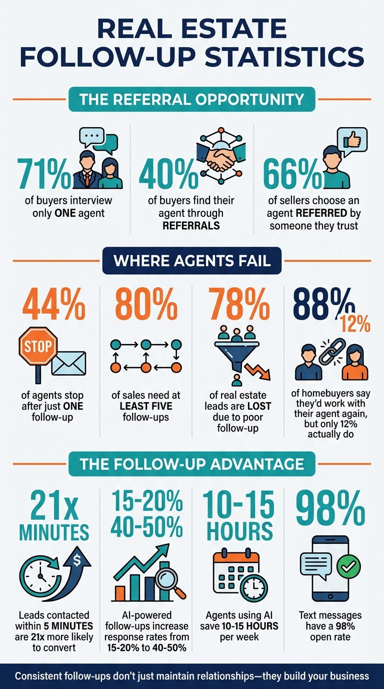 - Why Follow-Ups Matter: 71% of buyers interview only one agent, and 40% of buyers find their agent through referrals. Staying connected ensures repeat business and new opportunities.