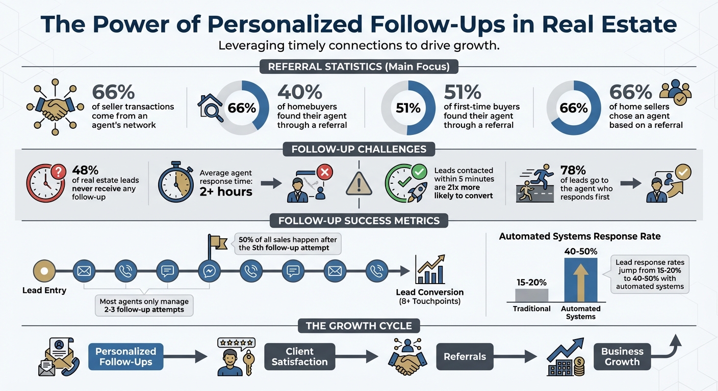 Building strong relationships is key to success in real estate. Here’s the bottom line: personalized follow-ups drive repeat business and referrals. While 66% of seller transactions come from an agent's network, many agents lose touch after closing deals, missing out on future opportunities. Automation can help, but generic messages often feel cold and transactional. The solution? Combine smart automation with personal touches to keep communication meaningful.