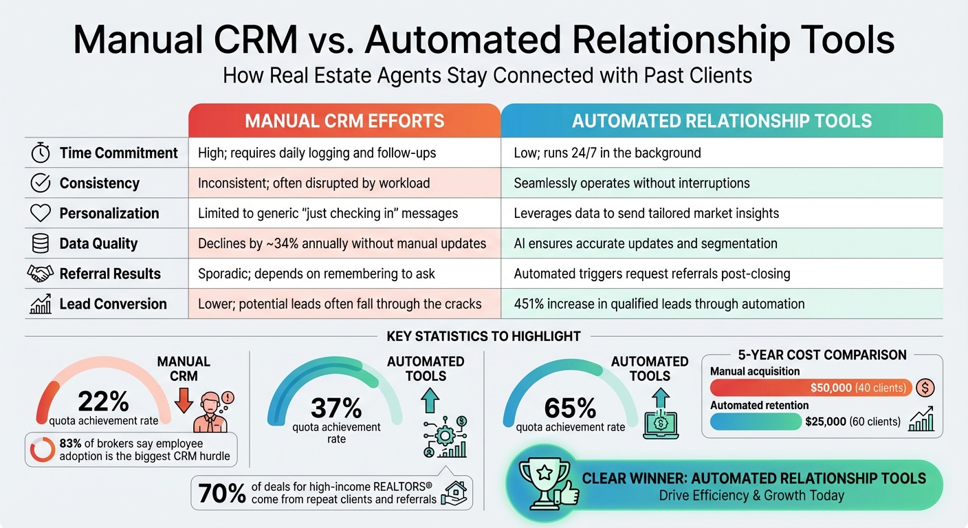 Automated relationship tools change the game. They automatically sync with your email to log conversations, flag key dates like birthdays or home purchase anniversaries, and use AI to segment your contacts by their stage in the buying or selling journey. This ensures every client gets tailored communication. The difference between the two approaches becomes even more striking when you compare the metrics side by side.